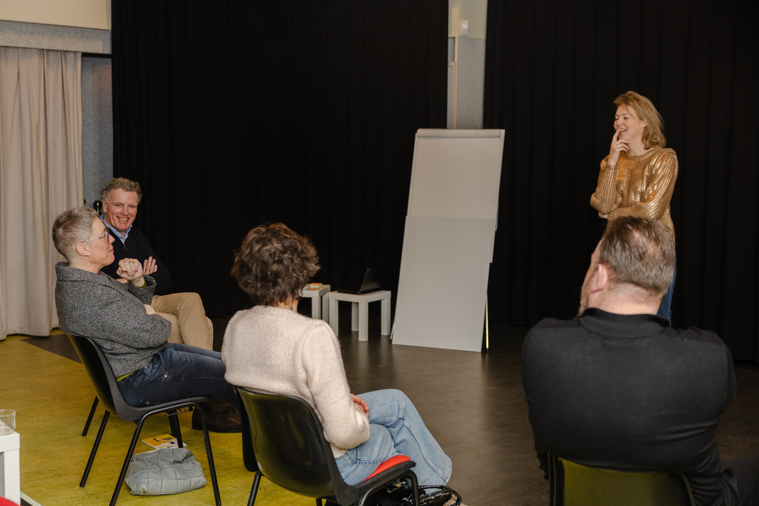 In onze open trainingen ervaar je dat spreken en presenteren niet zwaar of spannend hoeft te zijn, maar juist leuk, licht en impactvol. Geen lange theorieblokken, geen trucjes om “zelfverzekerd over te komen”. Wel korte, rake inzichten én doen: uitproberen, struikelen, leren en opnieuw proberen in een veilige setting waarin fouten maken goud waard is.